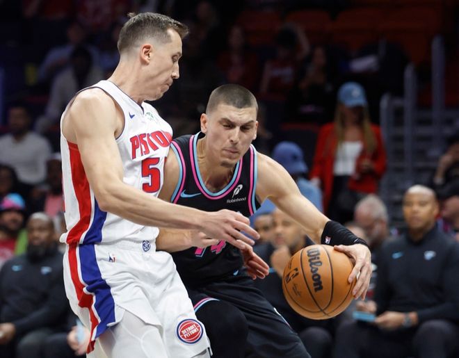 活塞在豪取追平队史最长的13连胜后,过去两场连续惜败活塞与魔术遭遇2连败,热火过去6场豪取6连胜。本场活塞缺少杜伦、勒维尔、克林特曼与萨瑟,热火缺少罗齐尔与哈克斯。首节比赛双方早早开启拉锯战缠斗,两队持续紧咬比分至23-23,活塞首节后3分钟打出一波13-0攻势,首节结束活塞36-23领先热火13分优势。首节活塞24中15超过6成准星,其中三分8中4,坎宁安5中4高效得到9分4助攻。热火被限制只有22中6,其中三分10中2均是不足3成准星,希罗6中0得到0分梦游。